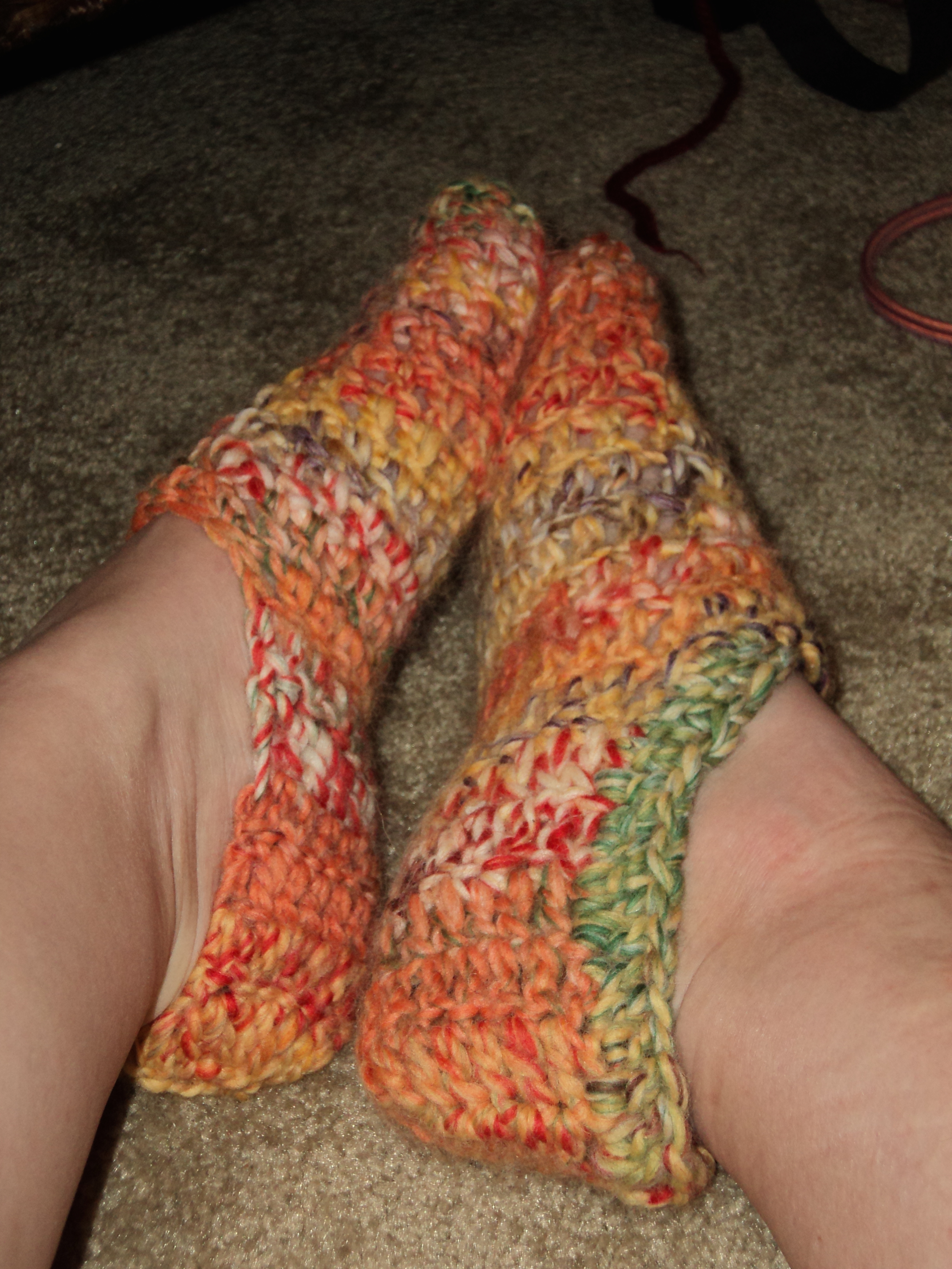 I found a simple slipper pattern on this website, and am quite please with the result of my own efforts. It’s simply a double stitch, but it’s much tighter (read: warmer) than my original efforts had been, and simpler, too! I adapted it a bit to fit my feet, which I guess are smaller than I anticipated.